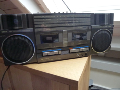 Der einzige Radiorekorder der das Dual Label trug. In Wirklichkeit stammte er von Hitachi. Das Gerät habe ich nach jahrelangem Suchen gefunden. Es war in einem erbärmlichen Zustand, da es sein Dasein als Baustellenradio fristete. Beide Laufwerke gingen nicht mehr. Nun läuft er wieder. Klanglich allerdings weit hinter vergleichbaren Grundig Geräten.