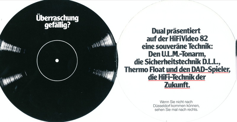 Diese kleine Broschüre wurde zur HifiVideo 1982 veröffentlicht. Das Prospekt ist in Form einer LP, welches in ein Dual Logo Cover gesteckt wird.