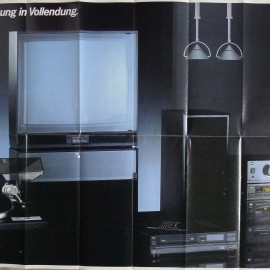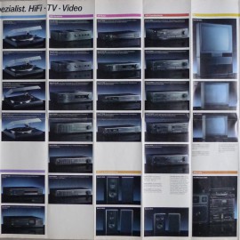 Ein Din A0 Poster mit sehr schönem Motiv der damaligen Top-Geräte aus Phono, Hifi und TV / Video. Die Bilder sind Fotografien. Das Poster ist nicht in besonders gutem Zustand.