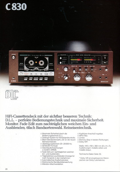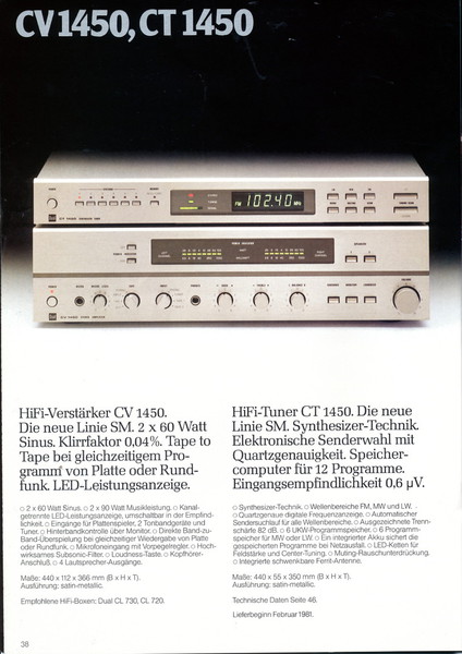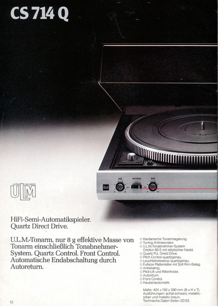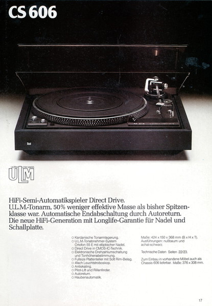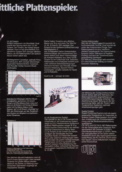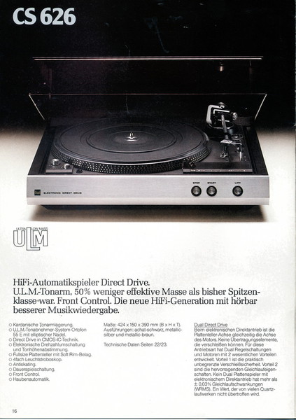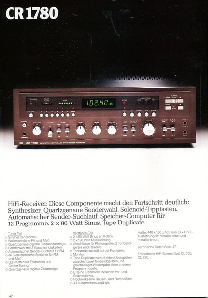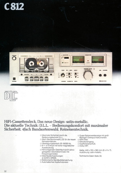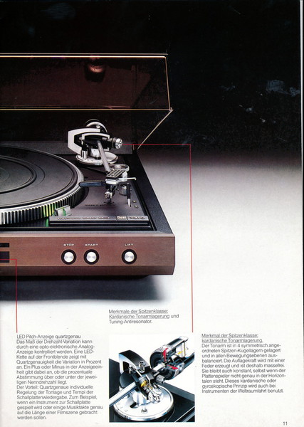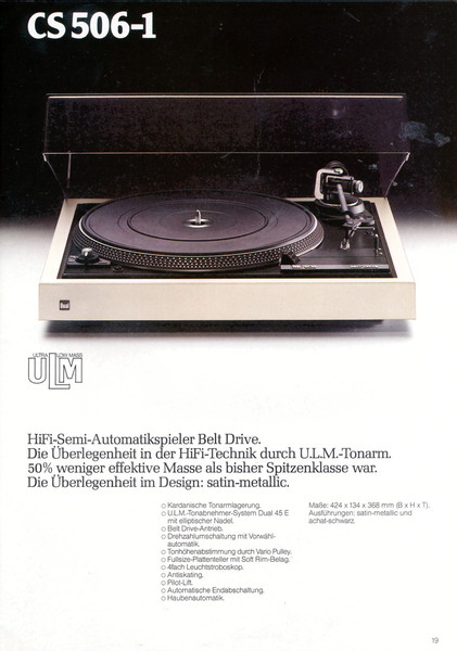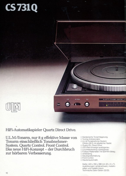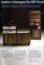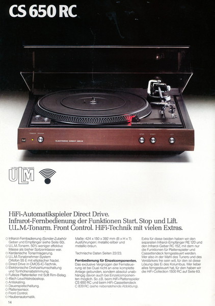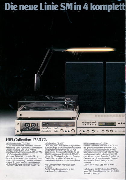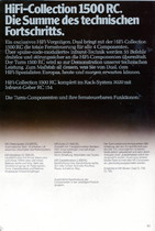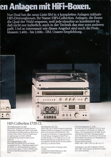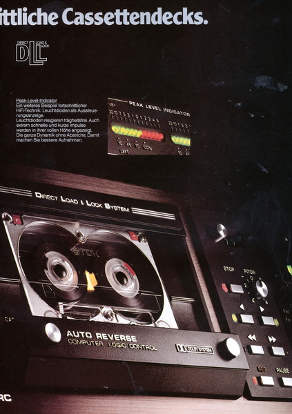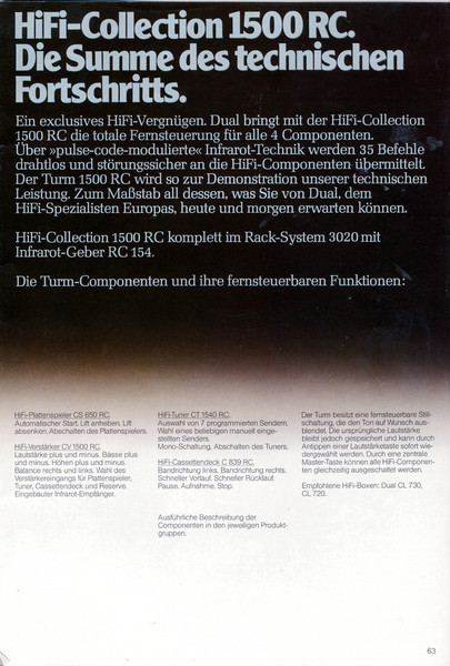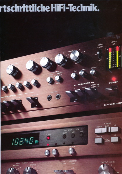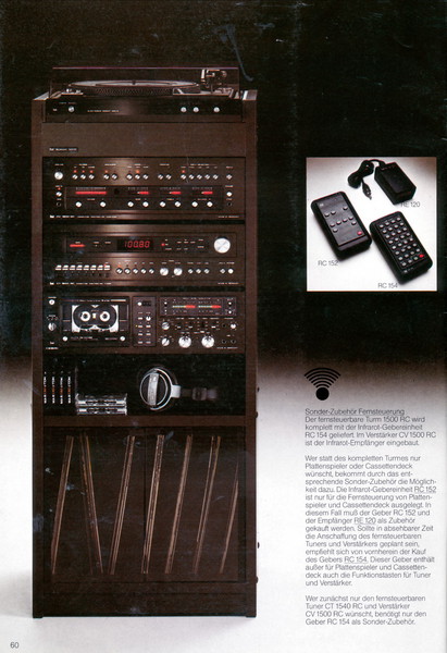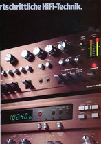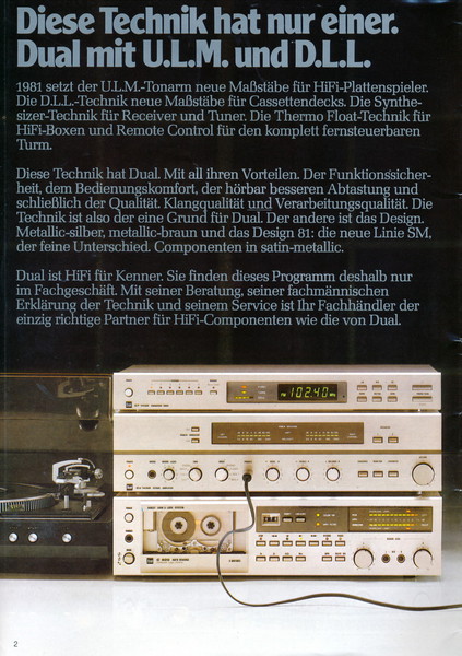 "1981 setzt der U.L.M.-tonarm neue Maßstäbe für Hifi Plattenspieler. Die D.L.L.-Technik neue Maßstäbe für Cassettendecks. Die Synthesizer-Technik für Receiver und Tuner. Die Thermo-Float-Technik für Hifi-Boxen und Remote Control für den komplett fernsteuerbaren Turm."
