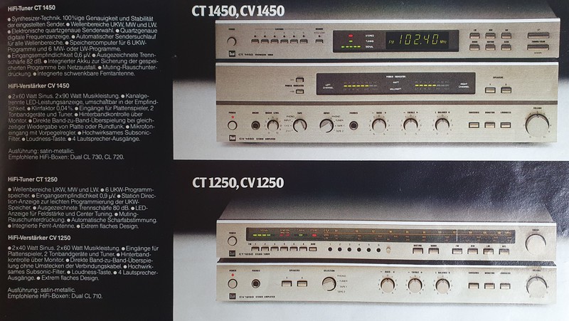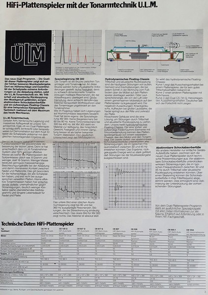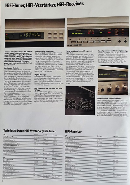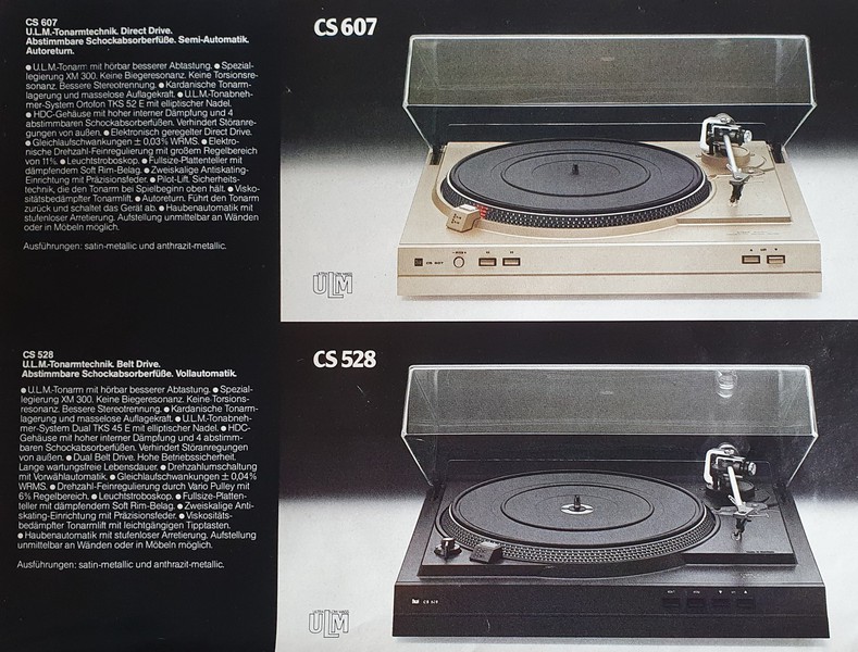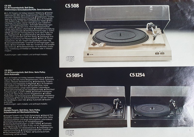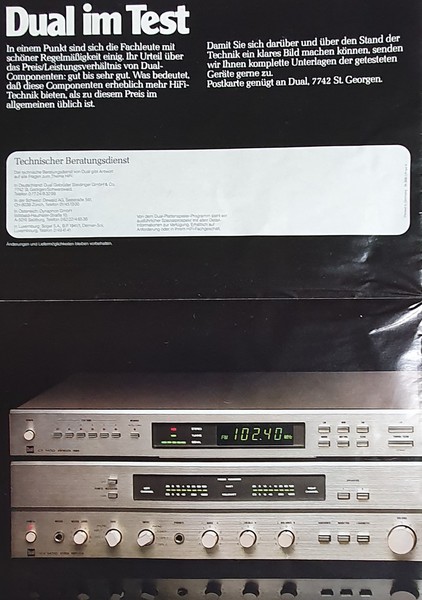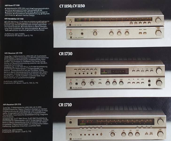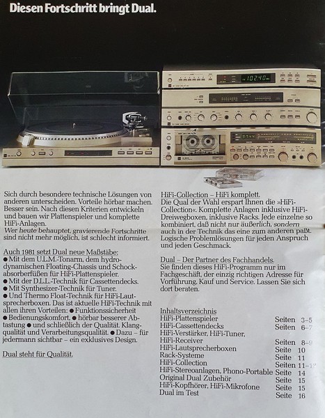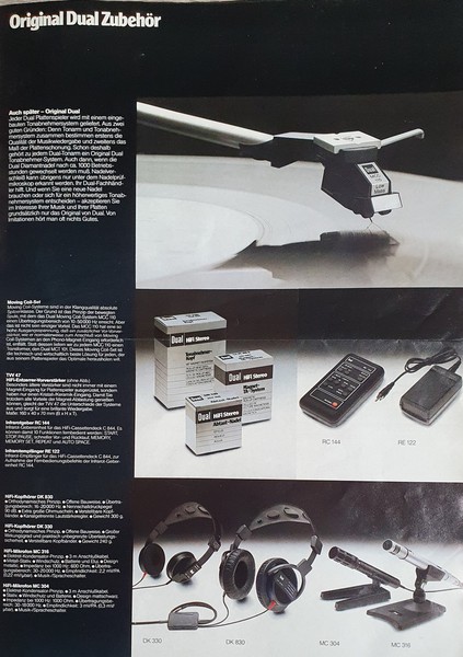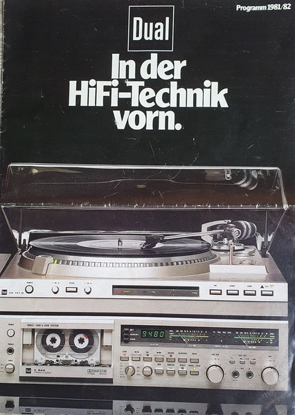 Ende 1981 kam eine komplett neue Gerätegeneration auf den Markt. Die neuen Plattenspieler der CS 7xx und CS 6xx Reihe basierten nicht mehr auf der bisherigen Platine. Die Gehäuse wurden vorwiegend aus Kunststoff rationell gefertigt, so daß eine große Modellvielfalt im gleiche Look entstand. Nur noch der CS 505-1 und der CS 1254 basierten auf der alten Technik. der 1254 war auch der letzte Plattenwechsler. Diese Tradition wurde somit beendet. Bei den Rekordern erblickte neben vielen anderen Geräten das C 844 das Licht der Welt. Es hatte damals neben Dolby C auch die Möglichkeit mit 9,5 cm/s aufzunehmen. Die Klangergebnisse waren phänomenal. Verstärker und Tuner wurden im Slim-Line Design entworfen. Auch merkte man bereits erste Anzeichen, dass die Gerätevielfalt und das äußere Erscheinungsbild dem Rotstift Tribut zahlen mussten. Weiterhin waren zwei Heimanlagen im Angebot, die sich durchaus sehen lassen konnten. Das Dual MCC 110 inkl. dem MCT 101 ermöglichte den einsatz eines hochwertigen MC-Abtasters. Die nachfolgenden Bilder zeigen die Geräte und sind aus dem Dual Programm 1981/82 entnommen. Neben den einzelnen Geräten sind auch die Katalogseiten zu sehen.