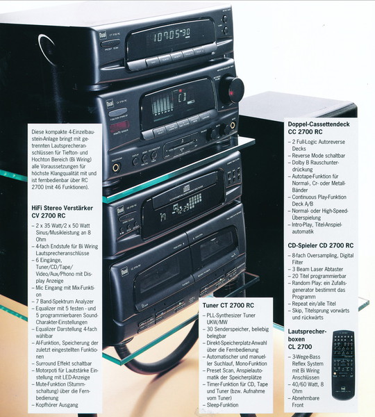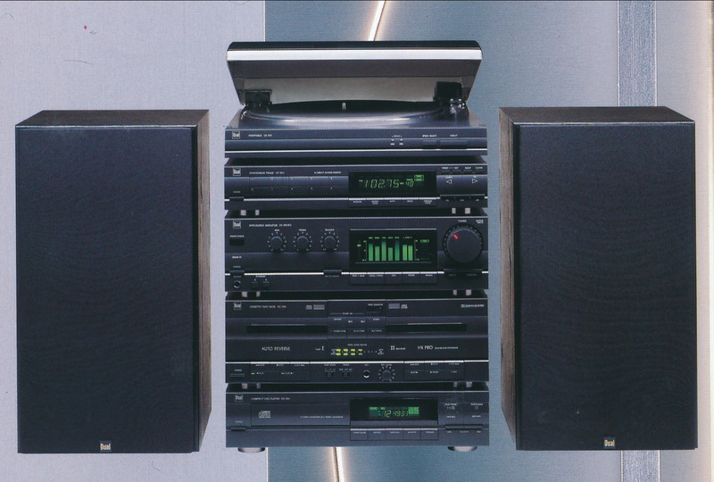 Der nach meinem Wissen letzte vollständige Dual Katalog der ursprünglichen Firma Dual. Hier werden noch einmal ein paar wenige neue Geräte gezeigt, die aber alle einer fernöstlichen Produktion entstammen. Mit dem Golden Stone, dem Golden 11 und dem CS 750-1 ist die Entwicklung der Plattenspieler an ihrem Höhepunkt und Ende angelangt. Die Wertigkeit der Elektronik lässt zu wünschen übrig. Während die Top-Einzelgeräte im 44er Format noch einen ganz vernünftigen Eindruck hinterlassen, sind die Komplettanlagen alle samt aus dem Schneider Programm. Verstärker und Tuner gibt es gar keine mehr, so dass die CV und CT Bezeichnungen verschwunden sind. Lediglich ein Receiver ist noch im Programm. Auch bei den Tape Decks wurde auf ein Doppel-Laufwerk reduziert.