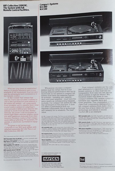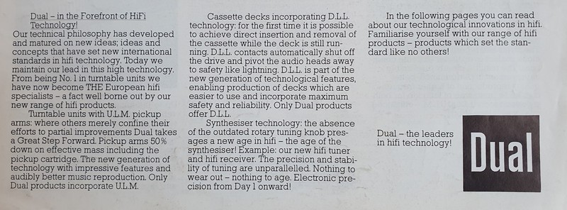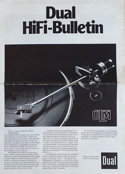 Schöner englischer Prospekt im A3 Format. Leider ist er nur schwarz/weiß. Gezeigt werden die wesentlichen Komponenten von "Dual-International" plus den ausführlichen technischen Erläuterungen, wie