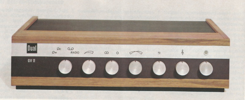 Das Jahr 1964 brachte einen weitern Dual Verstärker. Der bekannte CV1 war noch ein Röhrenverstärker mit 2*ECL 86 Bestückung. Der neue CV2 brachte immerhin schon 2*10W Sinus zu den Lautsprechern. Zusätzlich verfügte er schon über einen Phonovorverstärker. Die Chassis CK2 und die Haube CH1 kamen hinzu, vorallem für den 1009 und 1010. Der 1009 hatte einen neu konstruierten Tonarm, der horizontal und vertikal ausbalanciert war. Diese Konstruktion sollte für die nächsten Generationen von Plattenspielern, zwar in immer technisch ausgereiferter Form, beibehalten werden.
