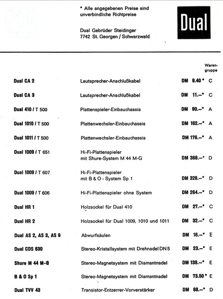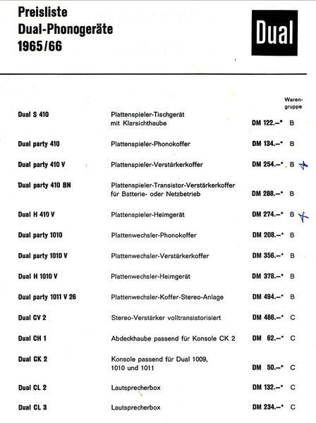 Wenn man bedenkt was heute klanglich möglich ist, war diese Aussage 1965 schon mutig. Phonokoffer waren der Hauptbestandteil des Portfolios. Die Single hatte seinerzeit ihren Höhenflug. Dual bot nur einen Verstärker und einen Hifi-Plattenspieler an. Der 1009 mit seinem Tonarm war damals High-End. Der Verstärker bot eine Leistung von 2*10 Watt udn die Lausprecher CL 2 und CL 3 waren für Leistungen von 10 bzw. 15 Watt ausgelegt. Für die Plattensspieler gabe es Systeme von Dual, Shure und B&O. Sicherlich interessant ist die beigefügte Preisliste.