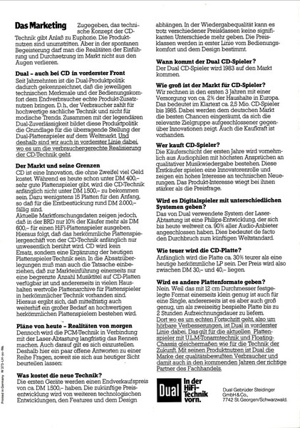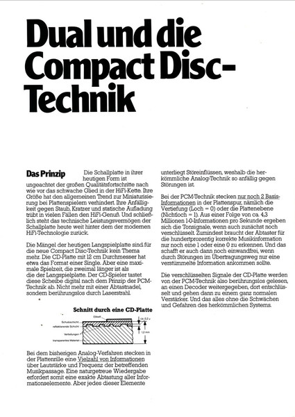 Mit dieser Zeiel ist die Broschüre zur Einführung der CD-Technik bei Dual überschrieben. Vorgestellt wird diese TEchnik am Beispiel des CD 110. Dieser basierte auf dem Philips Modell CD 101 und ging leider nie in Serie.