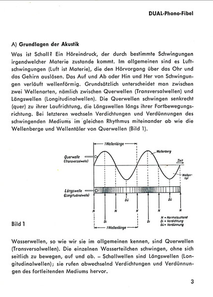 Die Dual Phono Fibel ist im Hosentaschenformat gehalten. Die hier gezeigte Ausgabe ist von 1957. Für dieses Alter ist sie in einem Top-Zustand. In Summe wird auf 57 Seiten die akustischen Grundlagen der Phono-Wiedergabe erläutert. Da kann man auch heute noch was lernen. Die Physik verändert sich ja nicht.